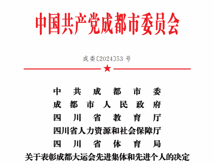 近日,中共成都市委办公厅印发《关于表彰成都大运会先进集体和先进个人的决定》,表彰一批大批成绩显著、贡献突出的集体和个人。宜宾学院体育与大健康学院获“成都大运会先进集体”称号,詹嘉文老师获“成都大运会先进个人”称号。