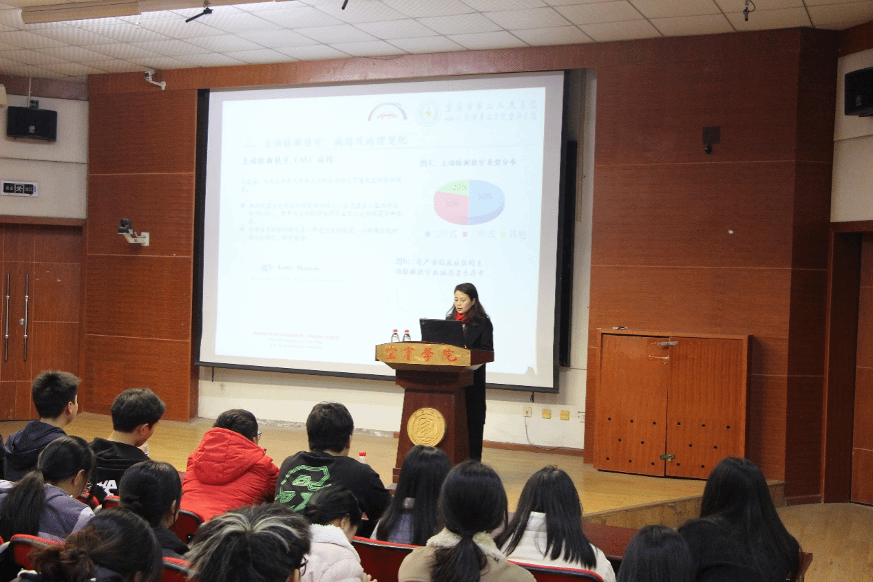 为了深入贯彻落实习近平总书记来校视察讲话精神,使学生进一步了解医学前沿动态,加深巩固专业知识,提升康复护理技能,营造校庆45周年浓厚的学术氛围,12月13日下午,体育与大健康学院特邀德国Lübeck大学医学博士、四川省医学会内科专委会常务委员、宜宾市第二人民医院心血管内科主任医师王娟博士在三教楼A101教室为医学专业师生作题为“瓣膜疾病的前世今生——经导管主动脉瓣置换术(TAVR)”的讲座。讲座由体育与大健康学院副院长刘亮主持。