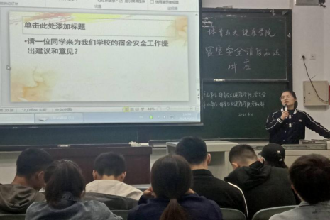 为提高学生寝室的安全意识,体育与大健康学院于2021年4月11日在三教A102举办了以“关注消防,珍爱生命”为主题的寝室安全知识讲座。讲座由团总支副书记、学生办公室副主任杨亚慧老师主持,各班主要学生干部参加,学生代表肖顺利主讲。