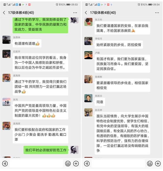 课后,体育与大健康学院组织2016级、2017级的同学在班QQ群、微信群、钉钉群中进行大讨论活动。在讨论中,同学们纷纷表示受益匪浅、深受感动。