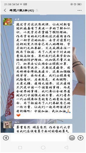 在讨论中,同学们纷纷表示,通过大思政课的学习,自己的思想受到了洗礼,进一步增强了“四个意识”、坚定“四个自信”、做到“两个维护”,坚信在以习近平同志为核心的党中央坚强领导下打赢这场疫情战,在疫情防控战中,以榜样为标杆,做出自己的贡献。