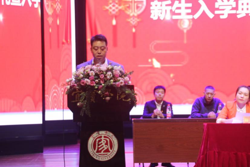伴随着宏伟的国歌声正式拉开了2020级开学典礼的序幕。随后,体育与大健康学院党建负责人串凯热情洋溢的发表了致辞。他介绍了体育与大健康学院的文化和发展历程,并呼吁全体新生从现在开始,为国家负责,为时代担当,为校园添彩,为自己点赞;并向新生提出了自立、自强、自尊、自信等几点要求。希望同学们在离开了父母温暖的襁褓后,迈开双腿走世界,不负青春好年华。