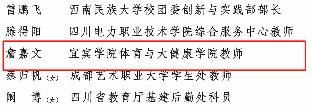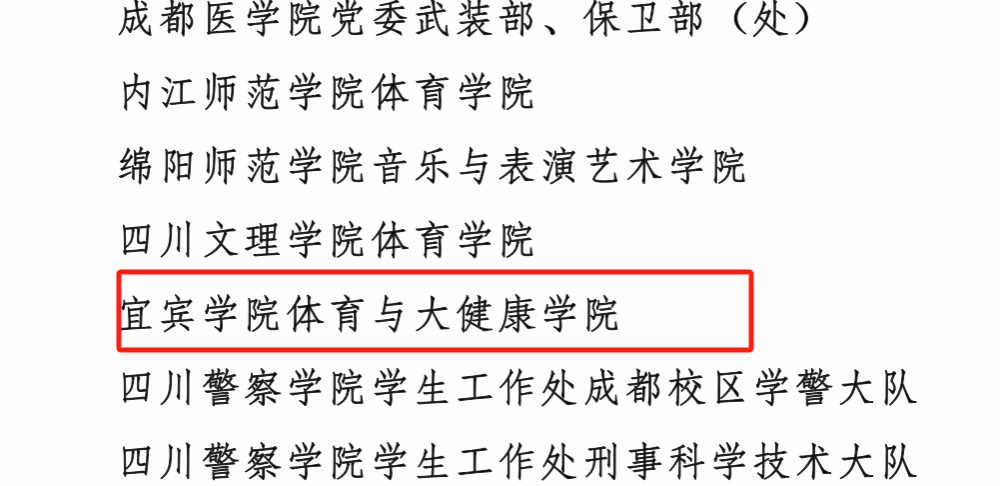 近日,中共成都市委办公厅印发《关于表彰成都大运会先进集体和先进个人的决定》,表彰一批大批成绩显著、贡献突出的集体和个人。宜宾学院体育与大健康学院获“成都大运会先进集体”称号,詹嘉文老师获“成都大运会先进个人”称号。