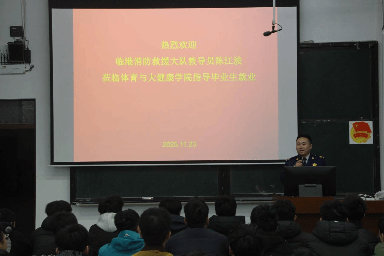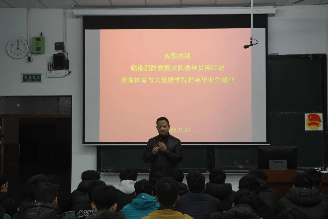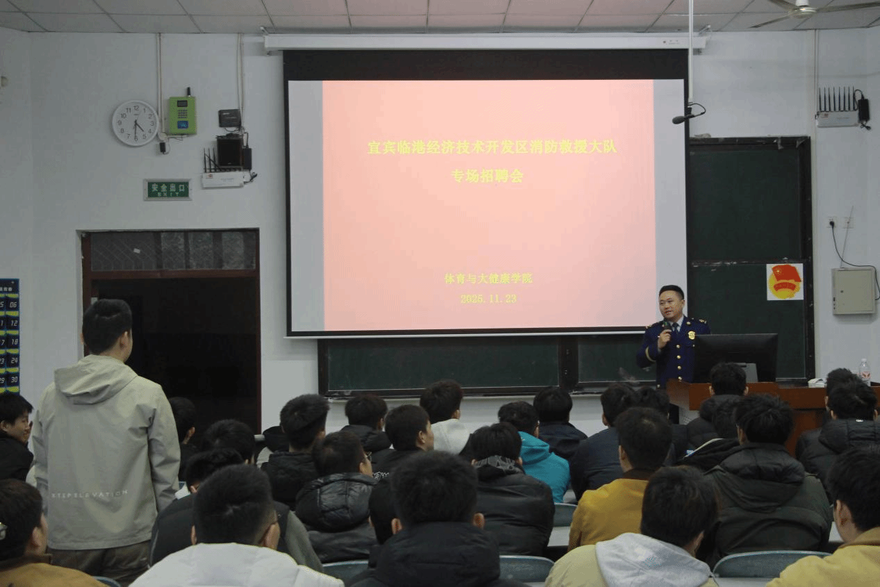 为精准对接体育与大健康学院毕业生就业需求,拓宽职业发展渠道,11月23日16:00,临港经济技术开发区消防救援大队在宜宾学院A区三教A102教室举办了毕业生专场招聘会。体育与大健康学院党委副书记谢江涛(主持工作)及2026届毕业生及部分班主任出席本次活动,宜宾临港消防救援大队教导员陈江波莅临现场。